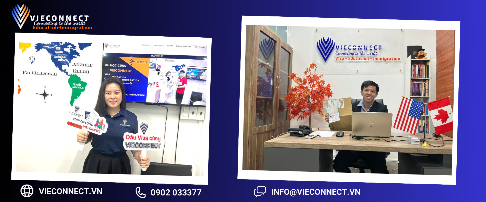 Vieconnect là công ty chuyên nghiệp về lĩnh vực Dịch vụ Visa, Tư vấn Du học và Định cư và làm việc, được thành lập với mục tiêu giúp đỡ các cá nhân và gia đình trên khắp Việt Nam thực hiện kế hoạch Du lịch, Du học, Làm việc hoặc Định cư tại nước ngoài. Chúng tôi hiểu rằng Quy trình xin Visa các nước phát triển, tìm kiếm thông tin về Du học và Định cư có thể rất phức tạp đòi hỏi sự hiểu biết và kinh nghiệm. Với đội ngũ chuyên gia giàu kinh nghiệm và kiến thức sâu về các quy trình Visa, giáo dục và di trú, chúng tôi cam kết cung cấp cho khách hàng dịch vụ tư vấn chất lượng cao, nhằm giúp khách hàng đạt được những mục tiêu cá nhân và gia đình của mình một cách thuận lợi và hiệu quả. Ngoài ra chúng tôi còn cung cấp các giải pháp Dịch vụ khác như: Tour Du Lịch, Dịch thuật, Hợp pháp hóa lãnh sự, vé máy bay, gia hạn Visa, làm hộ chiếu… sẽ mang đến cho khách hàng sự trải nghiệm trọn vẹn nhất.