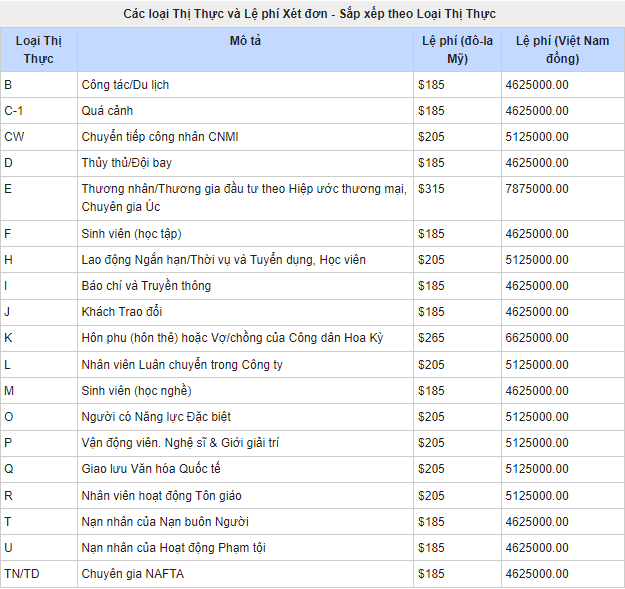Biểu phí xử lý đơn xin thị thực không định cư của chính phủ Hoa Kỳ